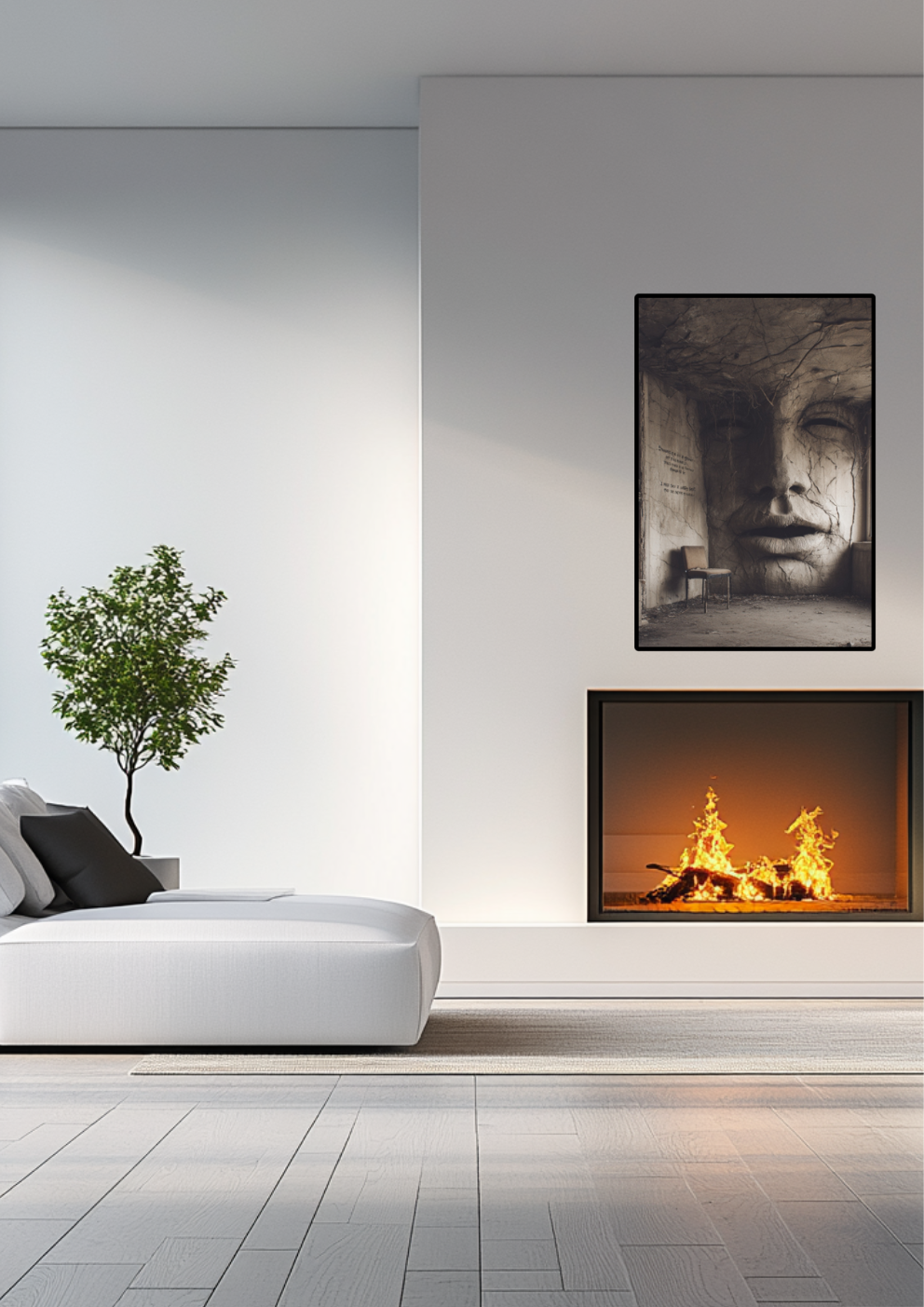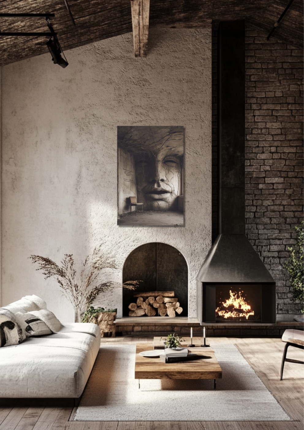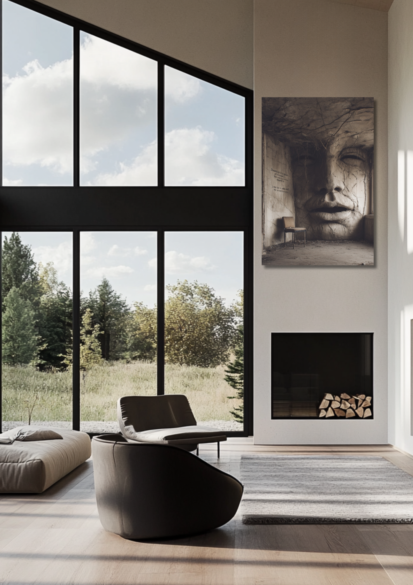 Ein verfallener Raum mit einem monumentalen, in die Wand gemeißelten Gesicht. Die Szene wirkt surreal, melancholisch und wie ein stiller Zeuge vergangener Zeiten.